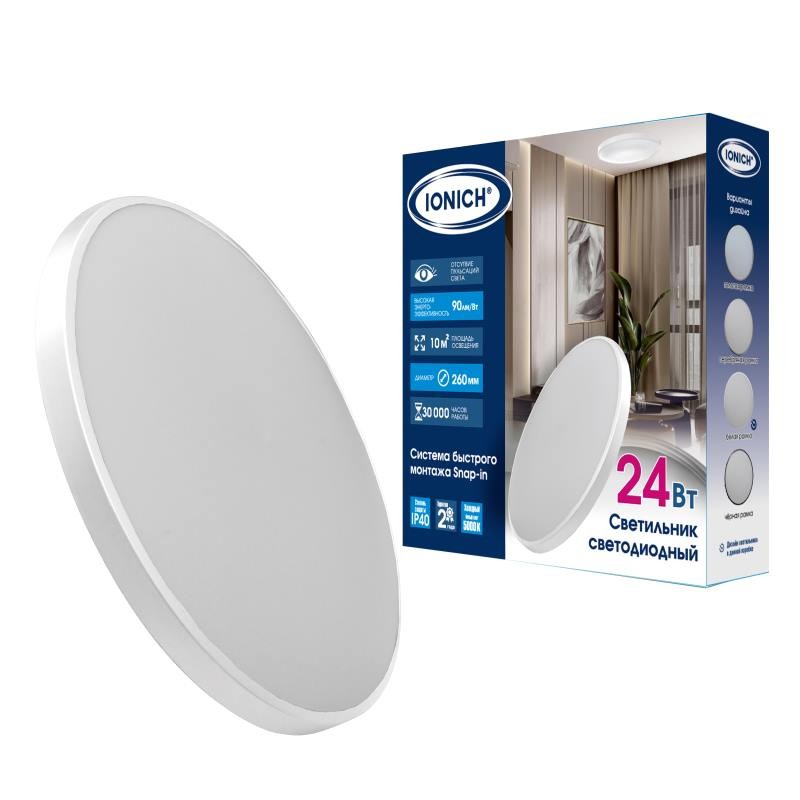 Светильник светодиодный акриловый 260мм IONICH "Snap In"24Вт 5000К 2160Лм IP40 белый S=10м2 2699*1/20