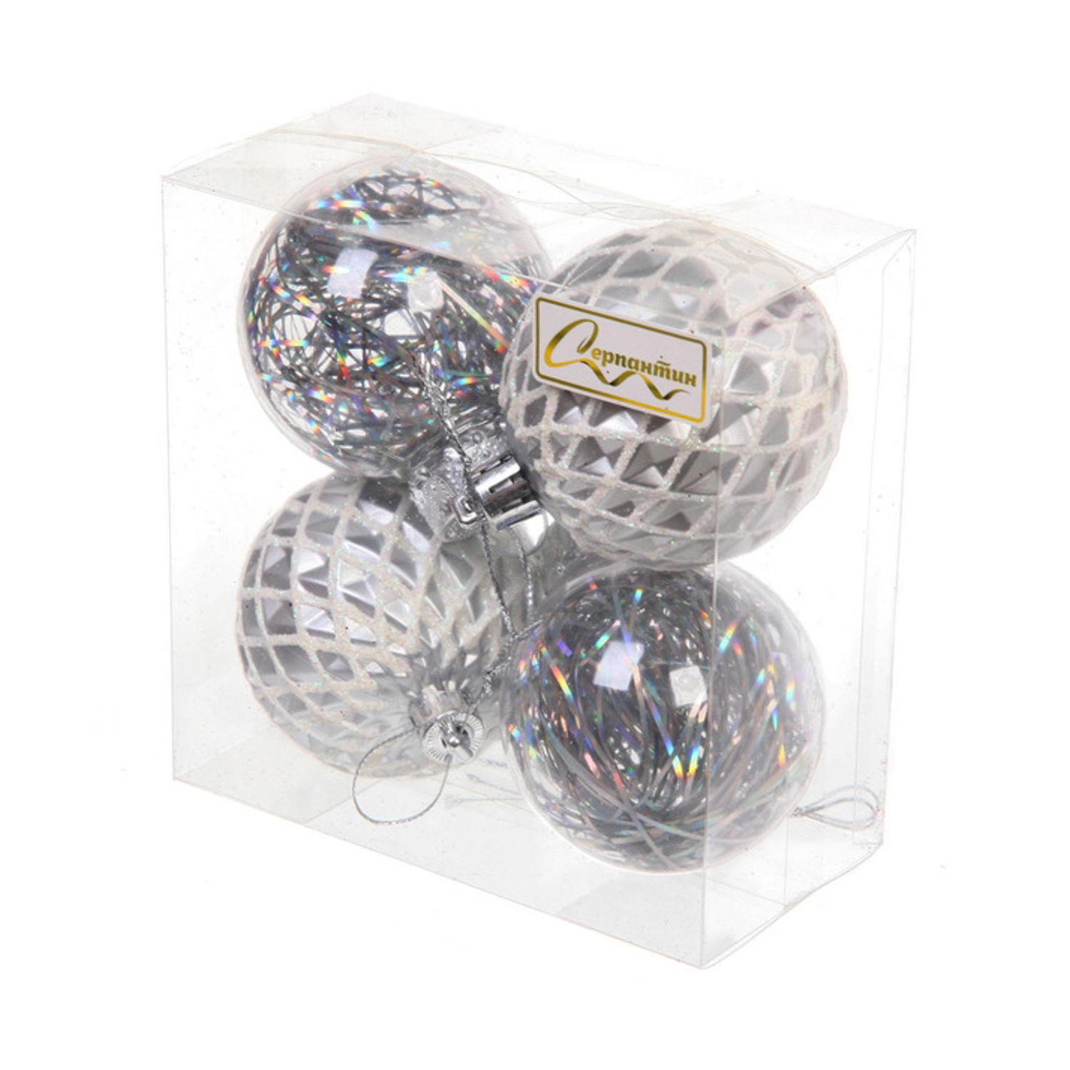 Новогодние шары 6 см (набор 4 шт) "Яркая метель", серебро/белый