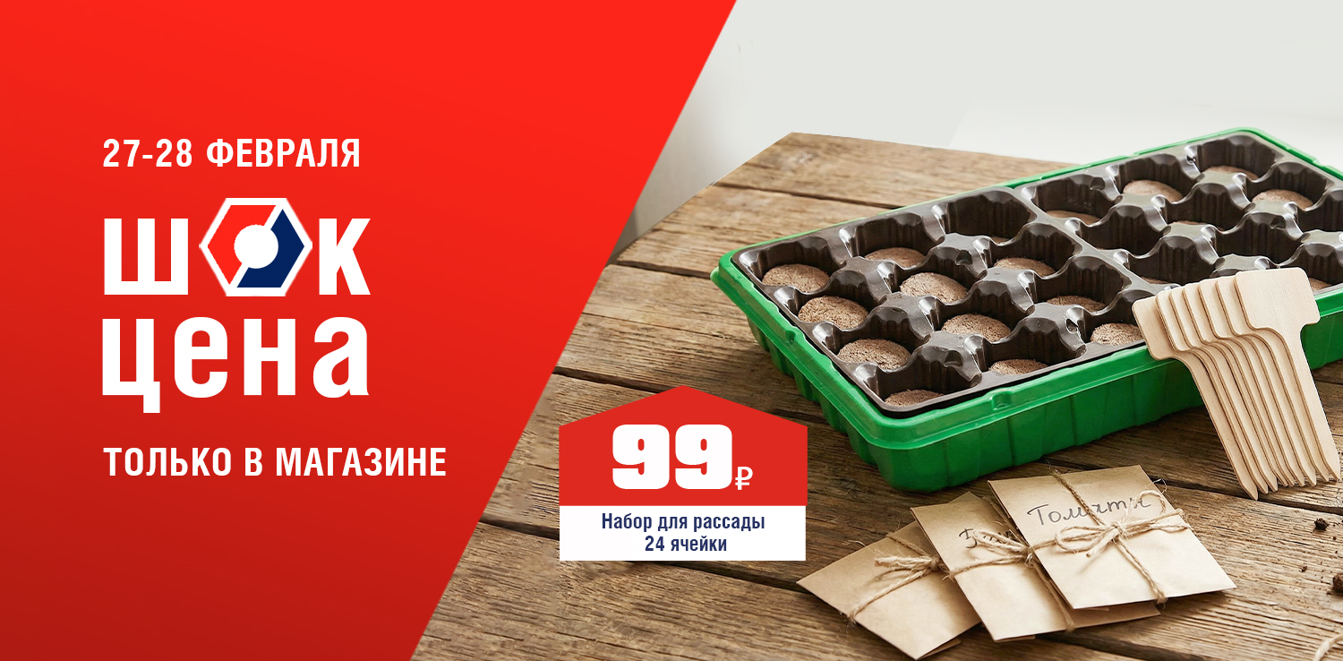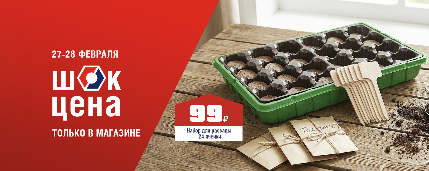 • арт. ББ467 Набор для рассады / 24 ячейки - 99 ₽ (не более 2 шт. в руки)Количество товара по акционной цене ограничено. Акция действует 27.02.2026 и 28.02.2026 г. в розничных магазинах ДомоСтрой. Акция не суммируется с бонусами, промокодами и другими акциями (в том числе со скидкой по дисконтной карте, скидкой для пенсионеров и акцией для новоселов). Акция действует только для физических лиц, на юридические лица скидка не распространяется.