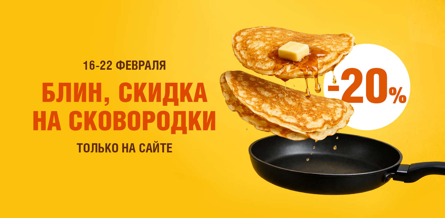 Только с 16 по 22 февраля — скидка -20% на сковородки. Обновляйте кухонный арсенал: выбирайте удобные модели, пусть блины получаются идеальными, а покупка радует ценой.